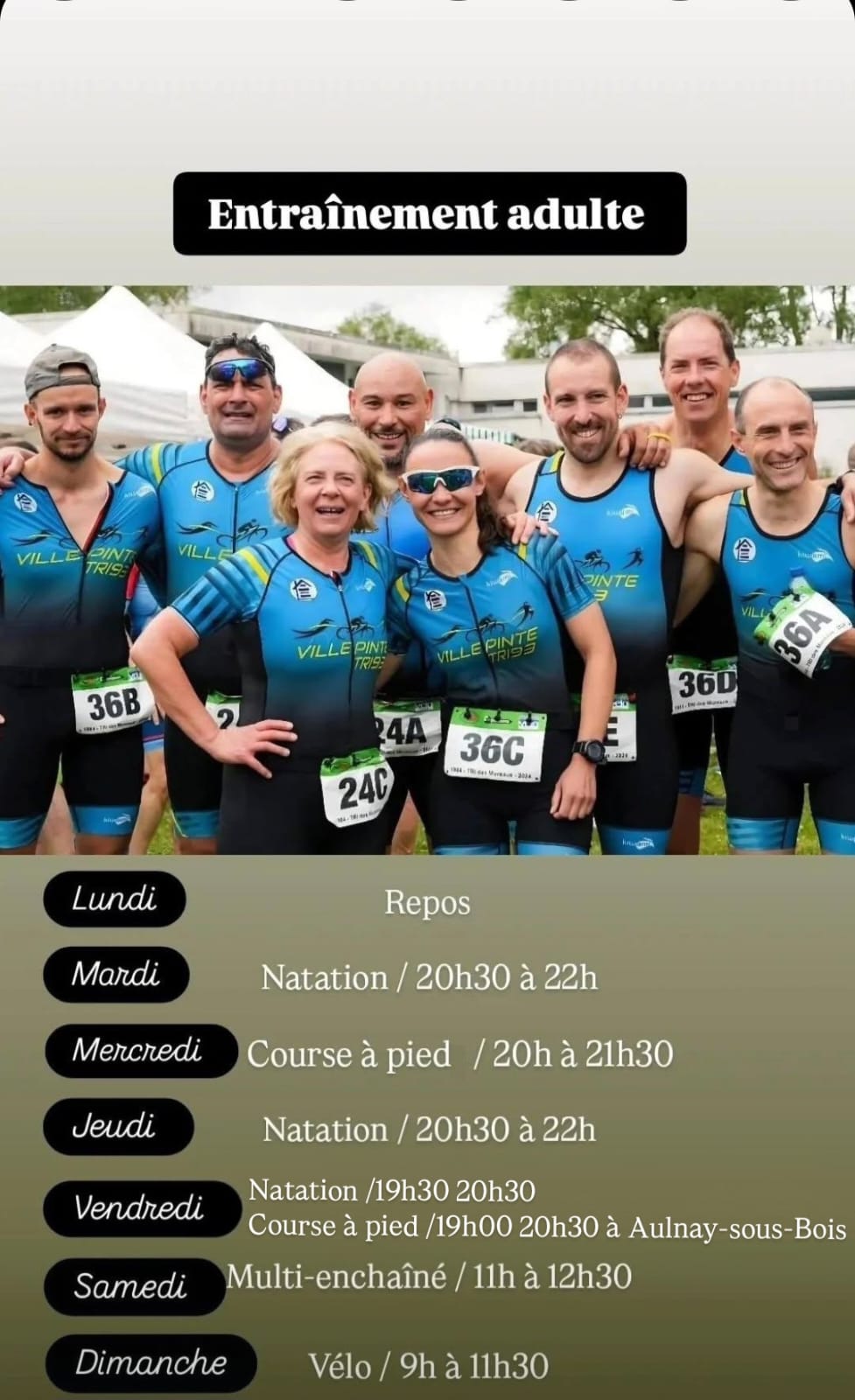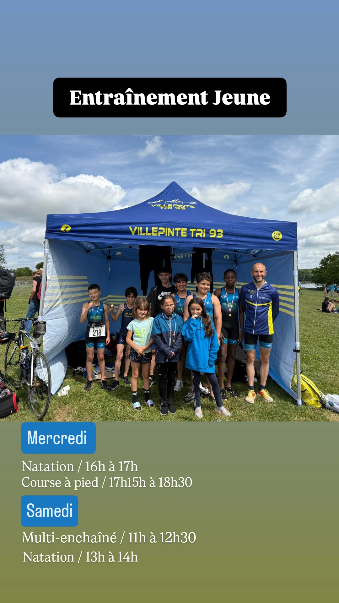 Samedi : Multi enchainé (Vélo, Course à Pied) au Parc du Sausset (parking des érables) de 11h00 à 12h30 et Natation de 13h00 à 14h00 à la piscine de Villepinte (rue Pierre Audat).